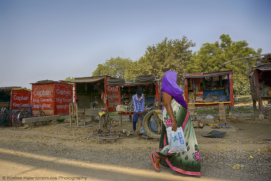 Street of repair shops at India’s Varanasi. Small wooden boxes are considered “shops”, all repairs are done on the ground. Bicycles, in this part.