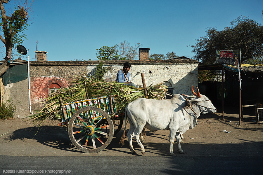 Oxen cart used to transport sugarcane for centuries. Not much difference although we are already in the 21st century. Aurangabad – Pune carriageway, India.